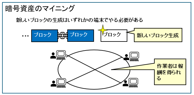暗号資産は銀行のような管理者が無く、サーバも無いため、誰かが取引の確認・記録の仕事をする必要があります。