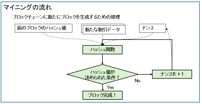 計算の内容は、前のブロックと、新たなブロックに格納するトランザクション(取引データ)、ナンスという数字の3つのハッシュ値を求め、予め決められた条件となれば完成となります。