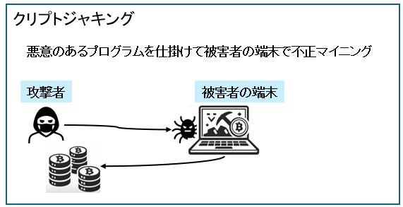 クリプトジャッキング(クリプトジャック)とは、不正マイニングを行うことです。