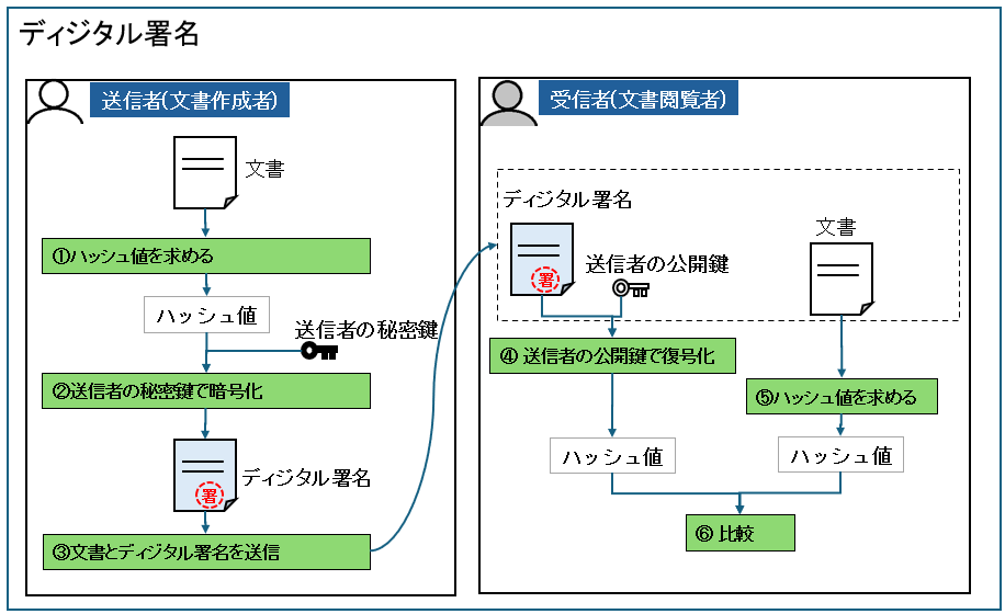 一致すれば文書が改ざんされていないことと、送信者が署名したことが確認できる。