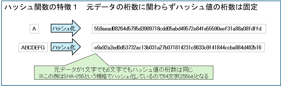 特徴1:元データの桁数に関わらずハッシュ値の桁数は固定