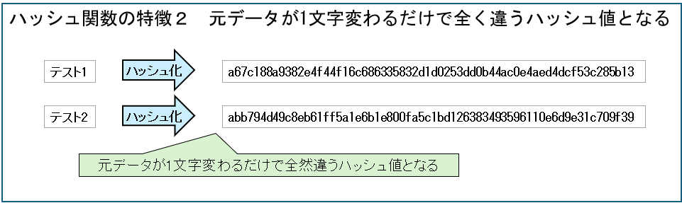 特徴2:元データが1文字変わるだけで全く違うハッシュ値となる