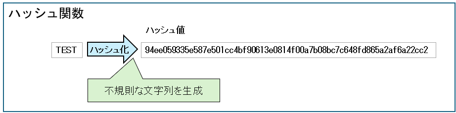 元データからハッシュ値に変換する計算を「ハッシュ化」や「ハッシュ関数」といいます。