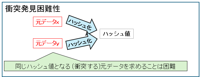 同じハッシュ値になる(衝突する)元データを求めようとしても、計算量が大きいために困難であることをいいます。