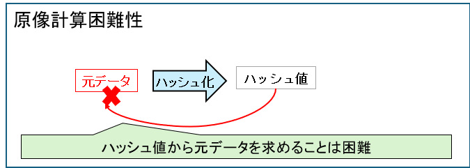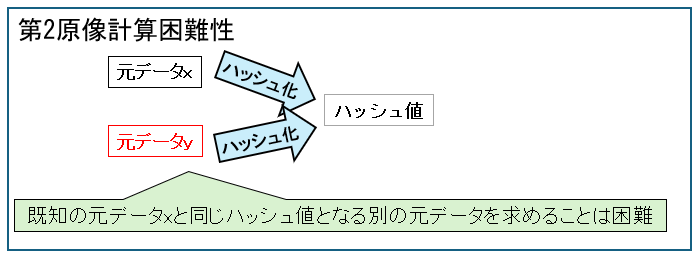 ある既知の元データとそれに対するハッシュ値が与えられた時に、ハッシュ値が一致する別の元データを見つけることは困難なこと。
