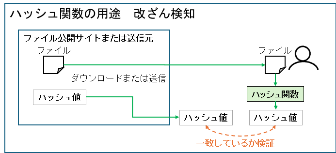 ファイル公開サイトや、メッセージ送信者がファイルやメッセージをハッシュ関数を使ってハッシュ値を用意しておき、受け取った側で同じハッシュを再計算して比較することで、途中で内容が改ざんされていないかを確認できます。
