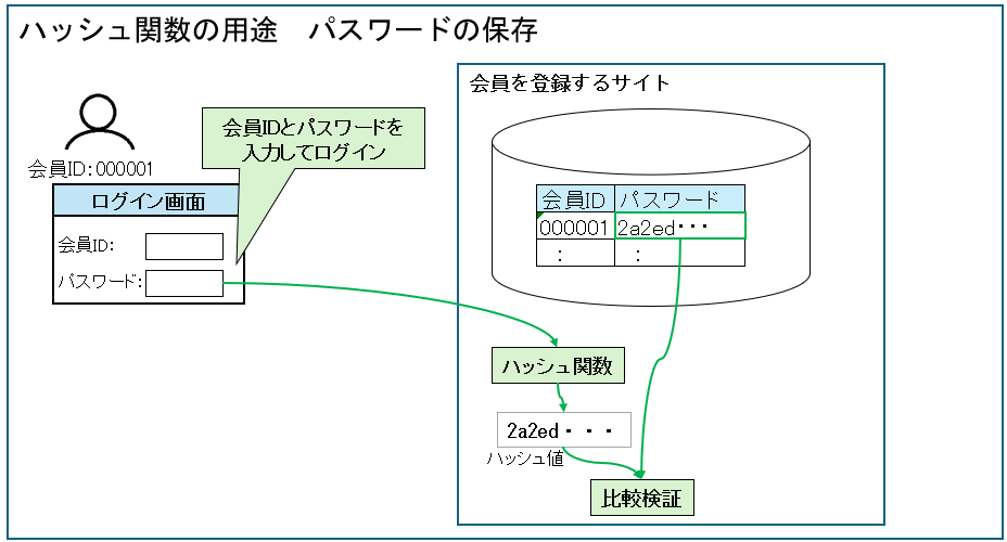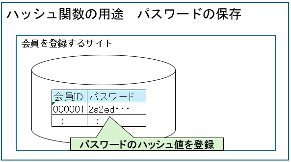 WEBサイトの会員パスワードなど、パスワードをそのまま保存せず、ハッシュ化して保存することで、万が一データベースが流出してもパスワードの漏洩リスクを低減できます。
