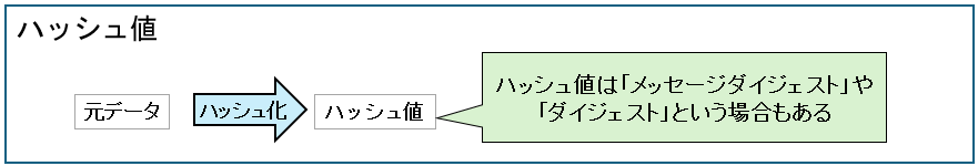 ハッシュ値は「メッセージダイジェスト」や「ダイジェスト」という場合もあります。