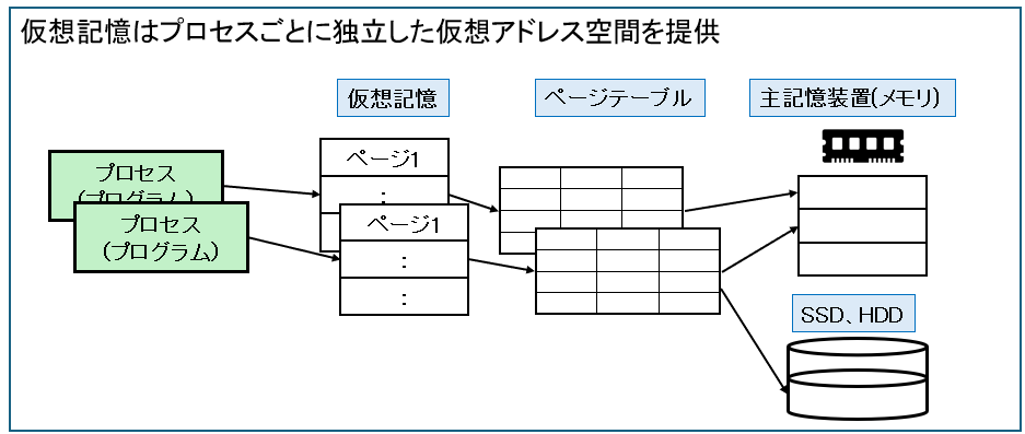 仮想メモリは、実際のメモリ容量よりも大きなメモリ空間を使えるように見せる仕組みで、主記憶(RAM)+補助記憶装置(HDD/SSD)を組み合わせて、メモリを大きく見せることができます。