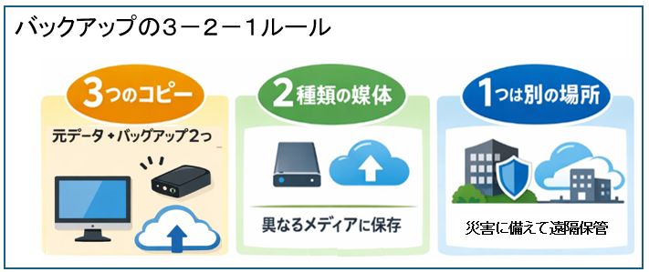 バックアップの「3-2-1ルール」は次の意味です。