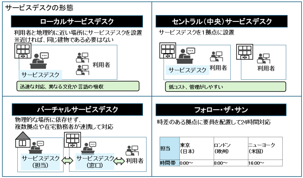 - サービスデスクの形態は、ローカル型、セントラル型、バーチャル型、フォロー・ザ・サン型など、組織のニーズに応じたサービス提供が可能