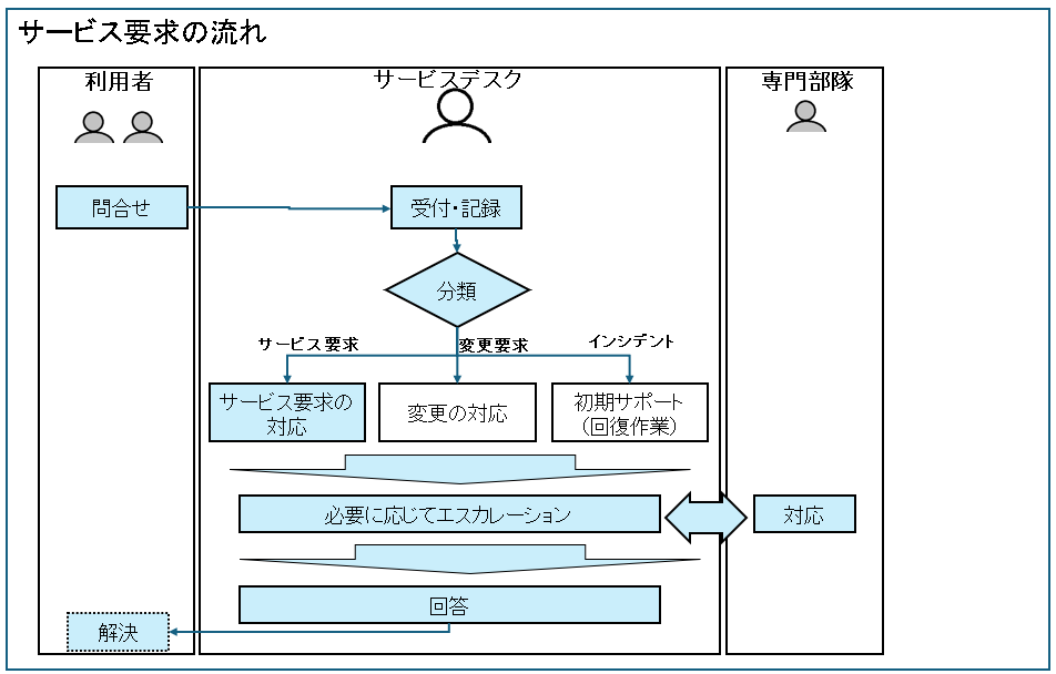 - 要求内容はサービスデスクで受付後、インシデント管理や変更管理と適切に振り分けされることもある。