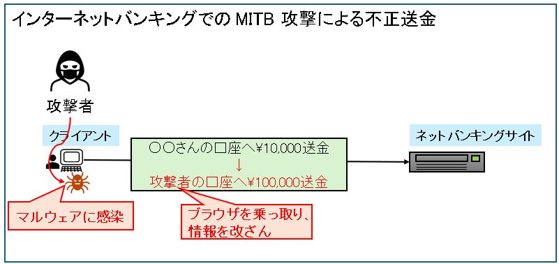 MITB 攻撃(マン・イン・ザ・ブラウザ攻撃)とは、Webブラウザとサーバーとの間に攻撃者が介入し、入力情報やリクエストを改ざんしたり、個人情報を盗聴したりすることです。