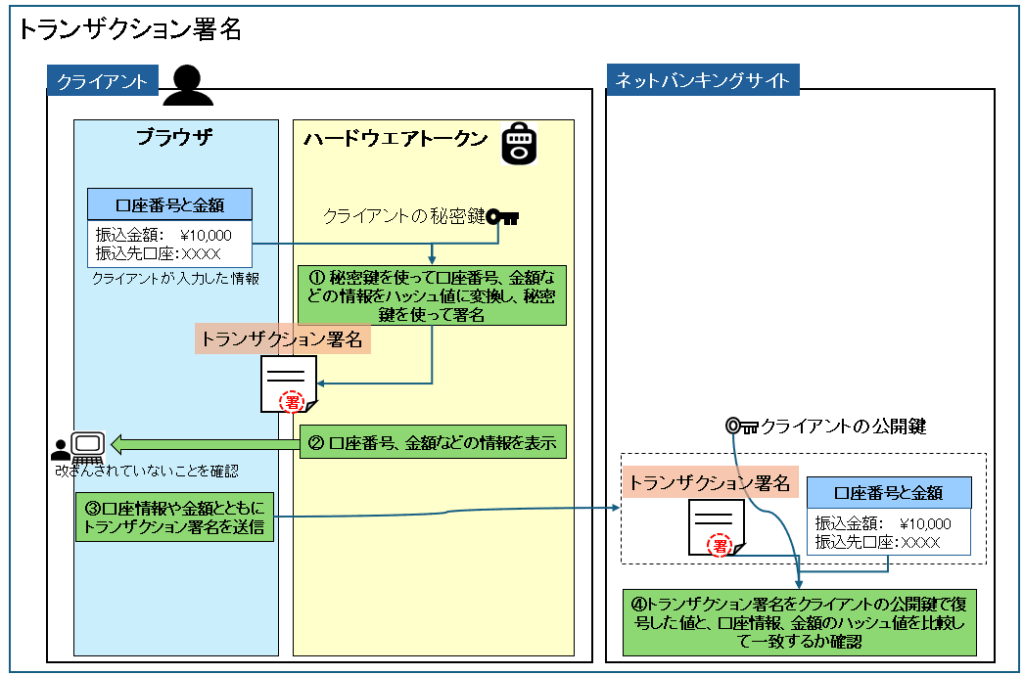 - ハードウエアトークンが、クライアントが入力した取引情報(振込先の口座情報や金額)をハッシュ値に変換し、これをクライアントの秘密鍵を使ってディジタル署名します。