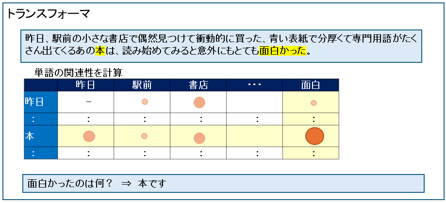 トランスフォーマーは長い文章であっても、文章全体を同時に見ることができ、この単語は、文のどの単語と関係があるかを一気に計算できるのが利点です。