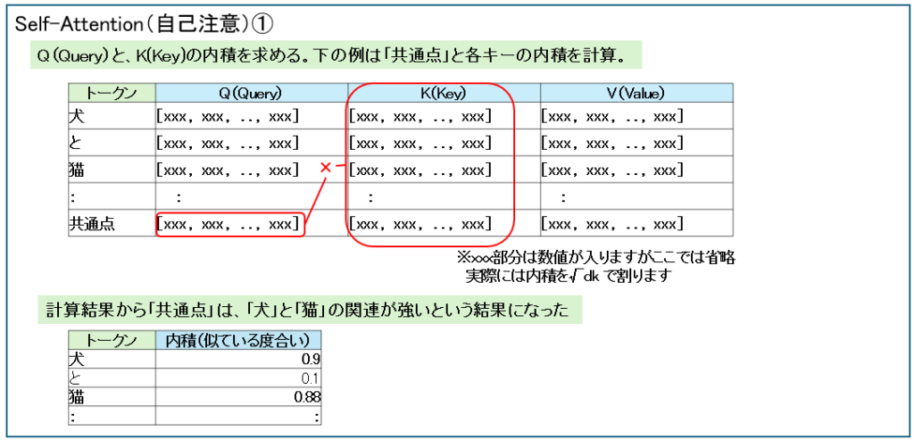 各トークンに対し、Q(Query)と、K(Key)の内積を求める。下の例は「共通点」と各キーの内積を計算しています。