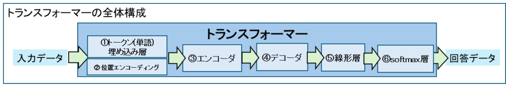 トランスフォーマは大きく分けると、トークン(単語)埋め込み層、位置エンコーディング、エンコーダ、デコーダ、線形層、softmax層で構成されています。
